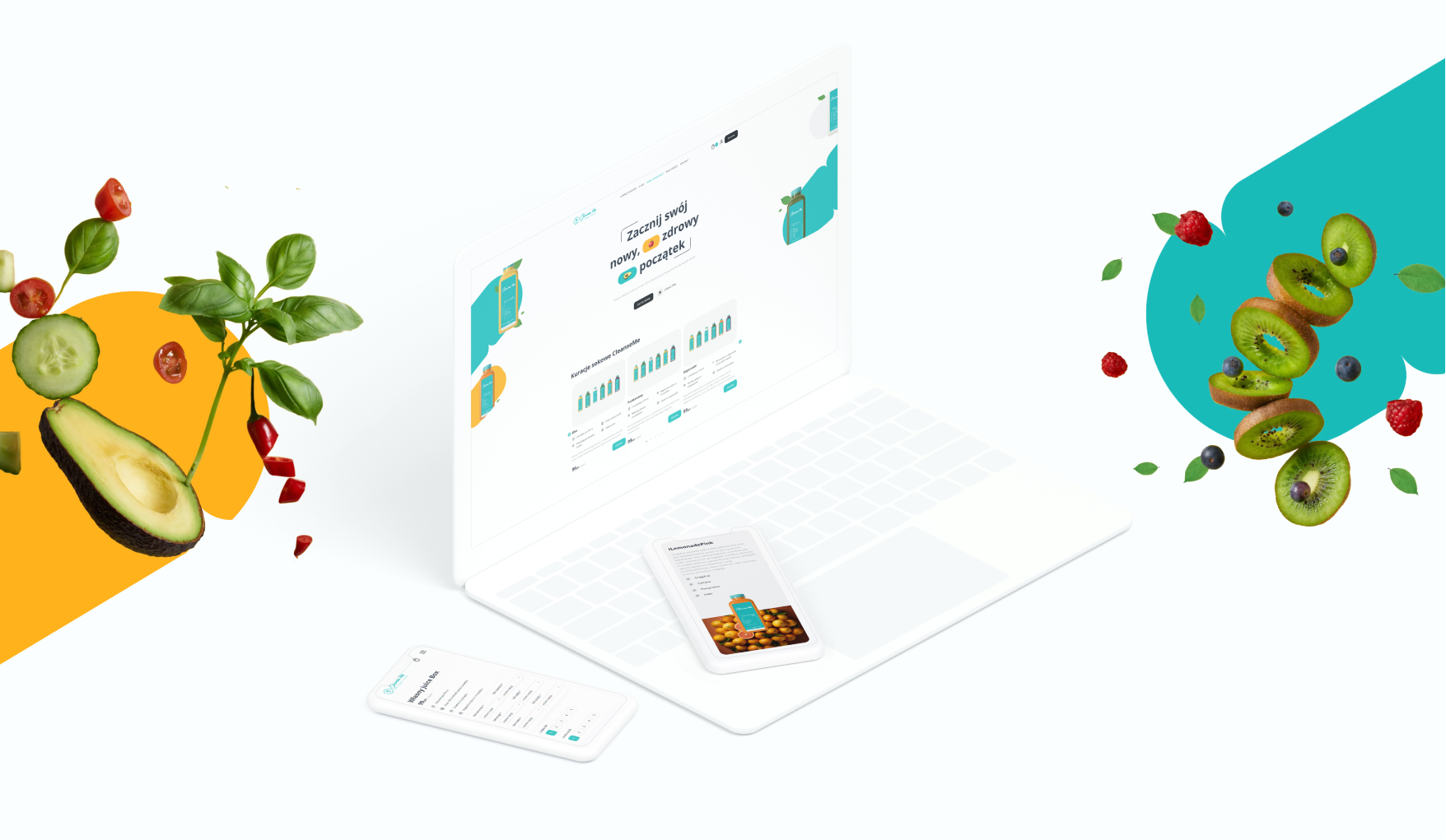 Nasze podejście do designu UI dla CleanseMe opierało się na prostocie i przejrzystości. Chcieliśmy, aby strona była zarówno estetycznie przyjemna, jak i funkcjonalna. Wykorzystaliśmy nasycone kolory, aby zwrócić uwagę na świeżość produktów i przyciągnąć uwagę użytkowników. Realistyczne elementy 3D owoców były wykorzystywane do ilustracji różnych smaków soków, dodając atrakcyjności wizualnej i ułatwiając wybór.