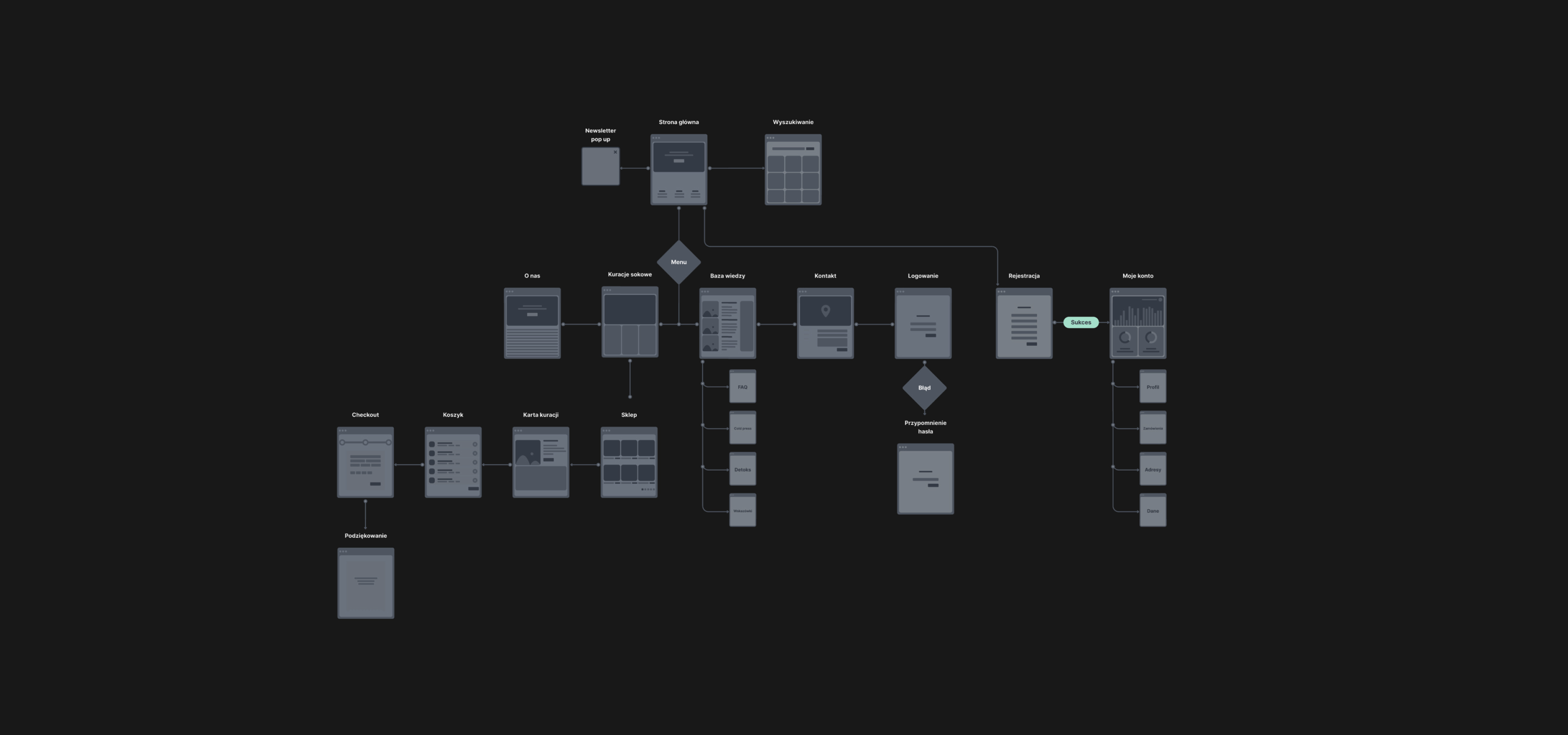 W naszej pracy nad doświadczeniem użytkownika (UX) dla CleanseMe, kluczowym elementem było strategiczne planowanie i projektowanie. Rozpoczęliśmy od stworzenia mapy strony, która pozwoliła nam zrozumieć strukturę i przepływ informacji na stronie. Następnie przeszliśmy do tworzenia makiet wszystkich stron, ze szczególnym naciskiem na proces sprzedażowy.